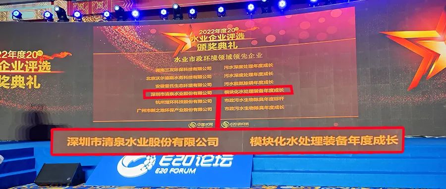 在本次論壇中,深圳清泉憑借優(yōu)異的綜合表現(xiàn)榮獲“水業(yè)市政環(huán)境領(lǐng)域領(lǐng)先企業(yè)——模塊化水處理裝備年度成長(zhǎng)”獎(jiǎng)項(xiàng)。此次獲獎(jiǎng),是對(duì)深圳清泉2022年在市政環(huán)境領(lǐng)域快速發(fā)展及領(lǐng)先地位的認(rèn)可。